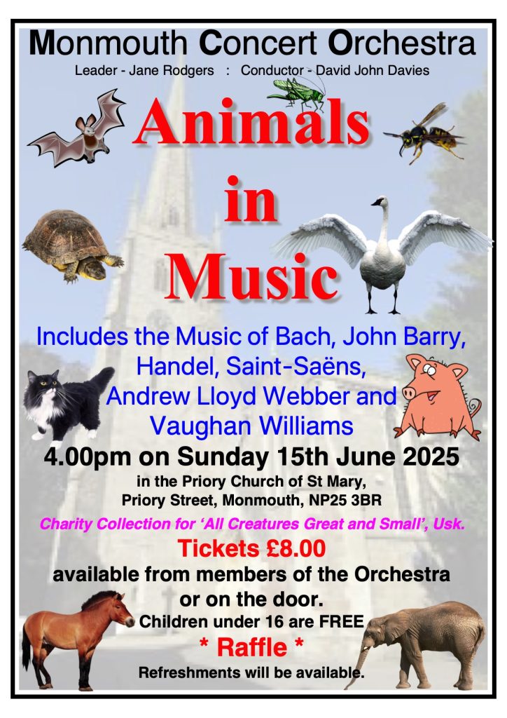 Monmouth Concert Orchestra played to a packed church on Sunday 15 June and delighted the audience with a programme of animal-themed music. The orchestra gave a resounding performance of Symphony No.3 Organ – Finale by Saint-Saëns accompanied by guest organist Philip Norman. Also by Saint- Saëns, The Swan was performed by lead cellist Rosemary Chatterton and other highlights included Die Fledermaus Polka by Johann Strauss II and Under the Double Eagle by Josef Wagner.